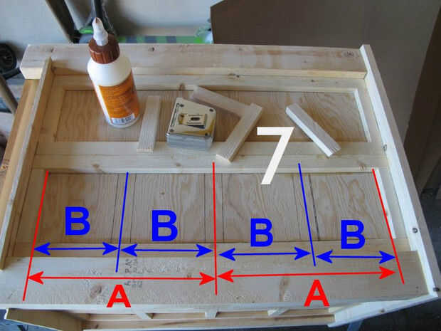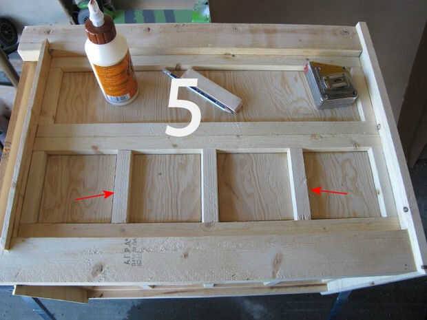 (Imagen 5) Dry fit todos que estos cortar piezas hasta tener la ubicación exacta establecida. Coloque dos piezas de ajuste en las líneas dibujadas en el cuadro 4. Las flechas en el cuadro 5 indican donde las líneas se encuentran en relación con el ajuste. Si todo funciona hacia fuera la pieza central debe ser exactamente de 4 pulgadas de cada una de las otras piezas que se han colocado ya. Si sus dimensiones están apagados, no el fin del mundo. Si esto ha sucedido, ubique el centro de la parte superior del panel inferior y marcar el punto central. Coloque el centro de ajuste. Luego medir el punto medio desde el medio ajuste a la parte superior / parte inferior recortar y marcar el punto central. luego colocar el siguiente ajuste. La clave es que quieres todo el adorno que la misma caja de tamaño entre ellos. Las fotos son un poco fuera de lugar pero en el cuadro 7 se puede ver lo que estoy tratando de explicar.