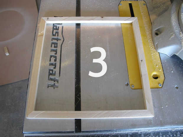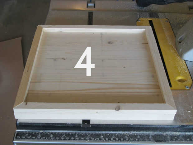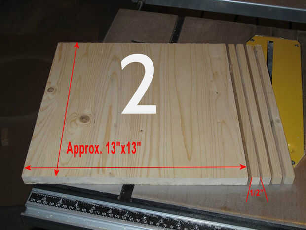 (Foto 2) Utilizando la misma hoja de la madera que usaste para hacer el piso de la mesa, cortar la parte superior. En mi caso fue cerca de 13 pulgadas por 13 pulgadas. Recortar también tiras de 4 1/2 pulgadas por lo menos 13 pulgadas de largo de la misma hoja.
