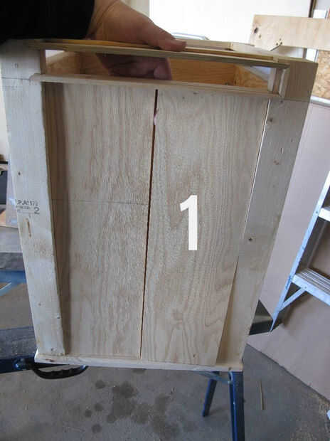 Me olvide de tomar una foto del primer paso, pero esto es fácil de hacer sin una imagen. Utilizando la madera que usaste para las otras tres paredes, cortar una pieza que se adapta a la perfección apertura frontal. Una vez que la Junta, córtelo por la mitad. (Cuadro 1) El espesor de la hoja le dará el espacio que necesita para que pueden abrir las puertas.