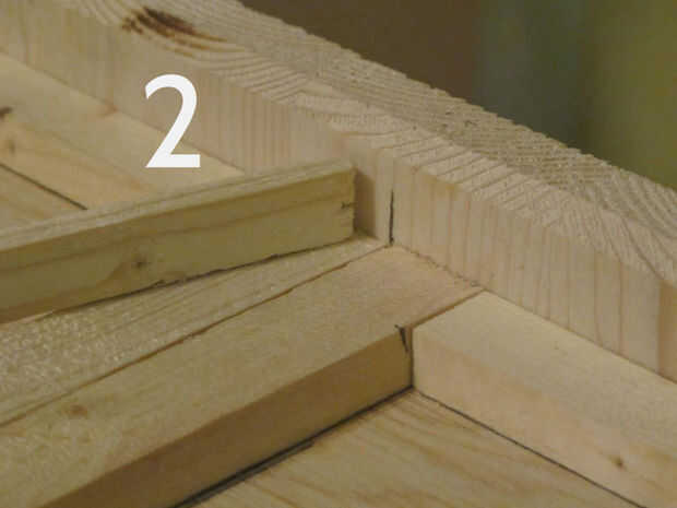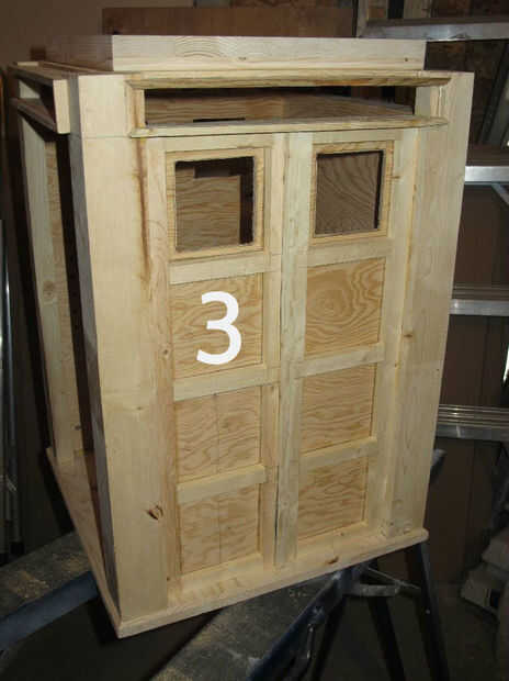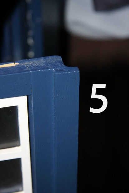 (Foto 2) Cortar una pieza de ajuste de la base a la parte inferior de la señal de la caja de policía. Marque el centro de la moldura en la parte superior e inferior y luego en la base de trazar una línea desde el hueco en la madera este recorte será cubierta. Para ello en el otro extremo, así bajo el signo de la caja de policía. Pegamento y sujete la moldura en su lugar.