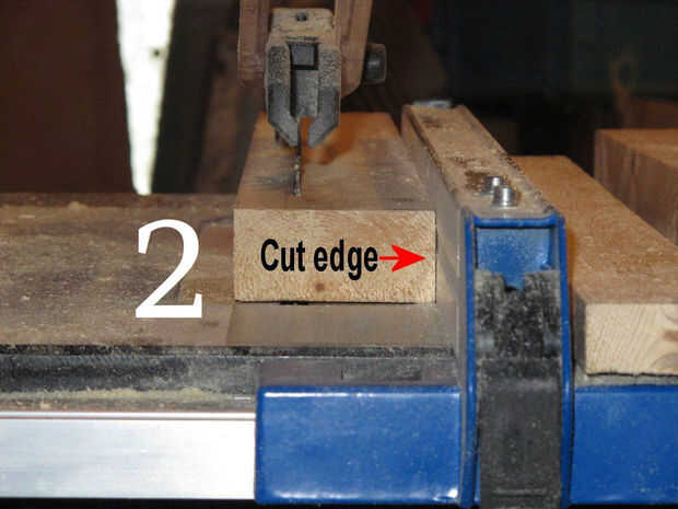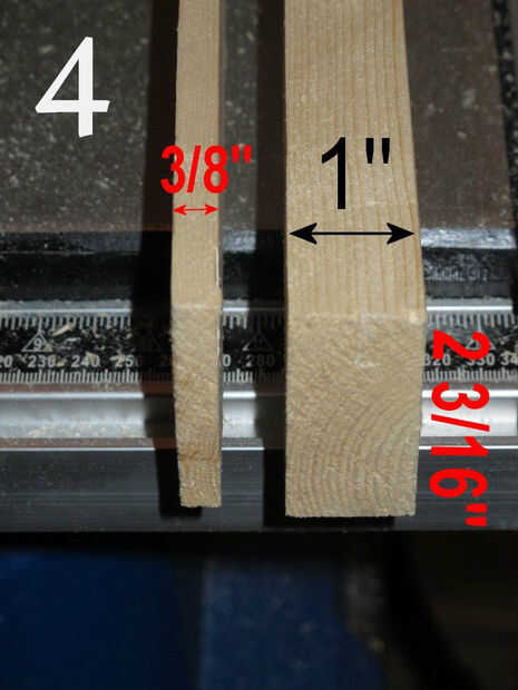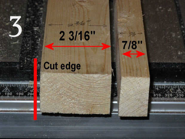 (Cuadro 2 y 3) Establecer la guía para un corte de 2 3/16". Coloque el borde cortado previamente contra la valla para que una vez que la placa se corta, el pedazo más grande será cuadrado en ambos lados. El corte será de alrededor de 7/8 de pulgada o un poco más grande. Dejar de lado el corte offs para ahora, usted volverá a ellos.