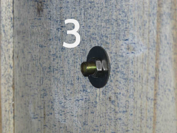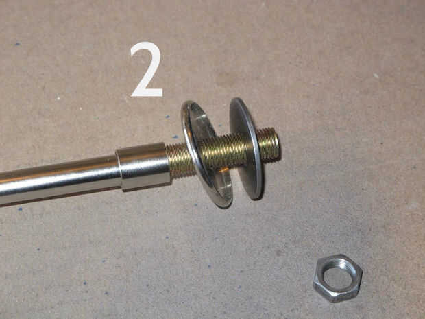 (Imagen 3) En la parte inferior de la tabla, coloque la otra arandela y apriete la tuerca. Todo encima de la mesa debería verse como la figura 4.