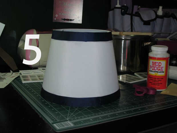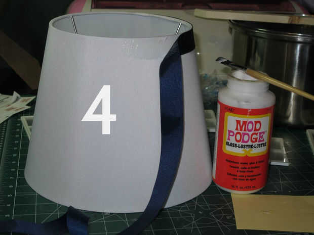 (Imagen 4) Utilizando el Modge Podge otra vez, aplique la cinta alrededor de la parte superior e inferior de la pantalla. Debido a esta sombra tiene forma más cónica que la sombra de barril, tomó algunos estiramientos de la cinta para que funcione. Después de luchar con él finalmente tuve que cortar la cinta y hacerlo en unas pocas etapas.