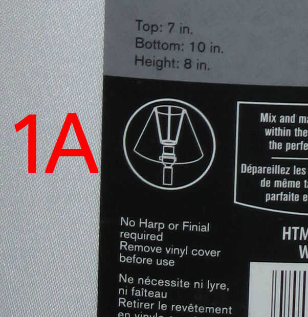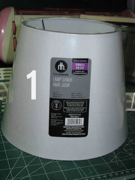 (Cuadro 1) Salir y encontrar una lámpara que te gusta. Algo a tener en cuenta es el cono más hay en la pantalla, más difícil es añadirle la cinta. Idealmente usted debe buscar una lámpara de barril. Las fotos son de cuando hice la segunda pantalla que hice. En la figura 2 puede ver la diferencia entre las dos pantallas. También tomé pantallas de lámparas que no necesitan accesorios adicionales como un arpa. Éstas tienen un anillo que pasa por debajo de la bombilla, cuadro 1A.