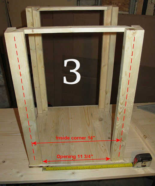 (Imagen 3) Ahora puede utilizar esta pieza de 14 pulgadas para enderezar la tabla. Lo pongo entre los postes de esquina en la parte superior para mantenerlos aparte. Entonces medí la apertura entre los postes en la base lado cuatro para confirmar que eran del mismo tamaño. Todos llegaron a 11 3/4" dar o tomar un 1/16 de pulgada... Lo suficientemente cerca. También medir desde el interior de la esquina de correos al interior post corer y fueron todas las 14 pulgadas.