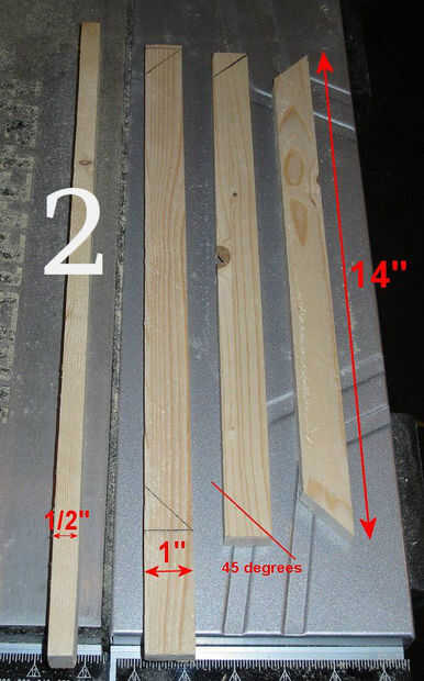 (Foto 2) Ahora necesita cortar su tercera 2 x 4. Corte 15" el final de la Junta. Se molino esta pieza a cortar. Necesita hacer cuatro piezas 1/2 "x 1" por 14" de largo. La razón que le sugiero 15 pulgadas de largo al principio es que fácil de refinar y hacer perfecto cortes con piezas más pequeñas. como veis en la foto corta las piezas progresivamente con el fin de asegurarse de que los cortes eran perfectos.