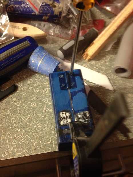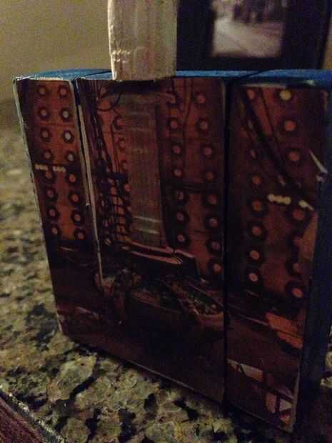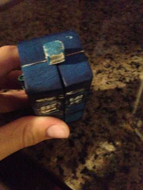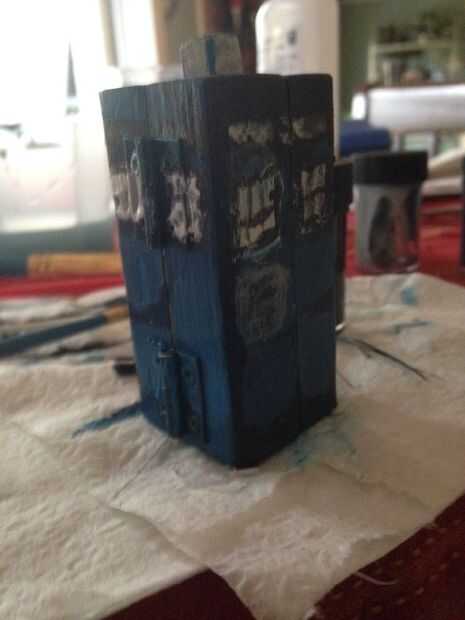 Esto es cuando la impresora, las bisagras y el pestillo entran en juego. Imprimí un cuadro de la sala de consola de la Tardis y había pegado en una capa de Elmers. Extienda el pegamento con un q-Tip para que no sangran a través de la imagen. Me puse las bisagras con un destornillador. A continuación os pongo algunos pintura para que se vea un poco como fue. Dejar todo este seco y luego pintar el cubo pequeño para ser la luz en la parte superior. Pegue al. Más grande de la madera piezas, pero asegúrese de que no conseguir pegado a los dos más pequeños. Una vez hecho todo esto, usted tiene usted mismo un mini Tardis!