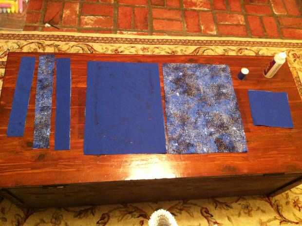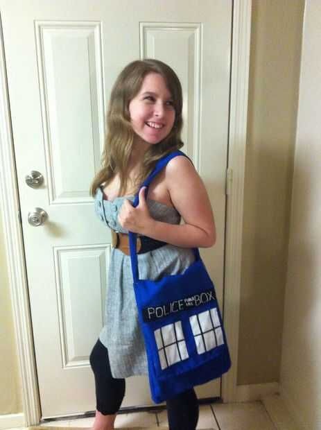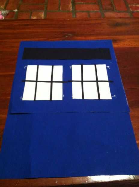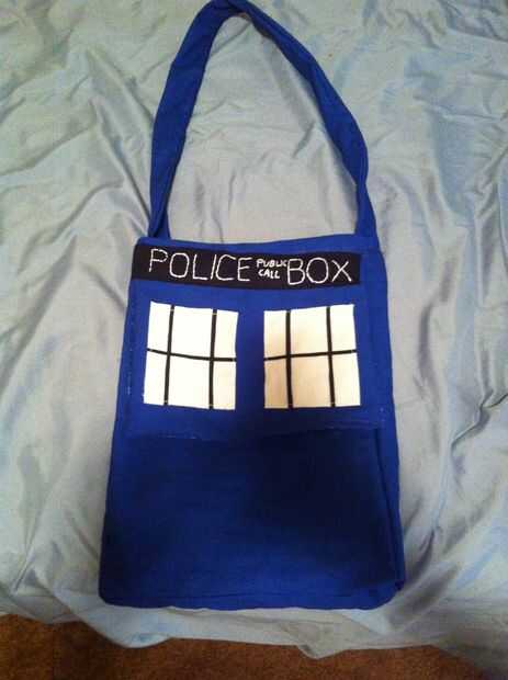 hice un monedero TARDIS para mi Doctor Who obsesionado sobrina! La tela azul que cortar dos trozos de rectángulo grande de tela para el cuerpo de la bolsa, de tamaño una mediano Plaza para la solapa, y luego dos tiras largas para el lado y una tira corta de la parte inferior. Entonces tomó un trozo con dibujos estrellado e hizo lo mismo y utiliza pegamento para tela para fijarlo. La correa es alrededor de 24 pulgadas de largo.