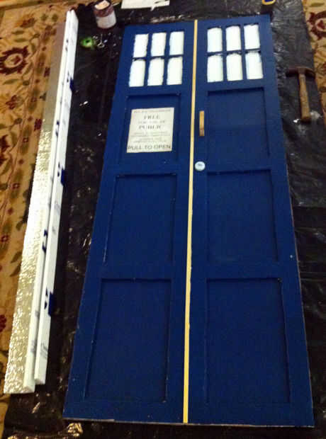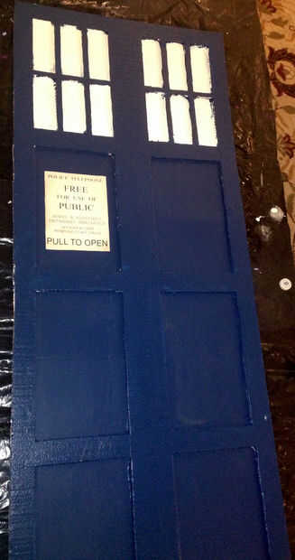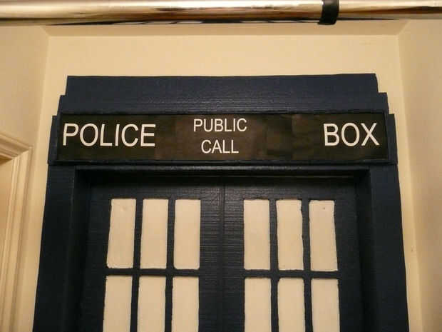 Las señales fueron todo hechas en la computadora e impreso. Tienes que elegir cual puerta de médico/Tardis que desea emular. Los signos clásicos "tire para abrir" pueden encontrarse en Internet. El signo superior tomó algún ensayo y error para que bien, y fue laser impreso con letras blancas sobre fondo negro.