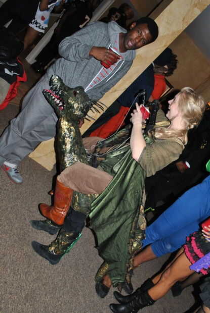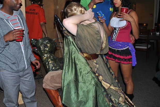 Con dos amigos, es mucho más fácil. Sólo necesitan sostener el traje lo suficientemente alto como para que subir debajo de él y de pie. Una vez arriba, las dos piezas de camisa son fáciles de colocar. Así que... plan de Halloweening en un grupo o hacer amigos con desconocidos en línea para el baño. Vas a necesitarlos.