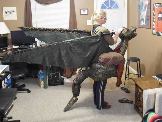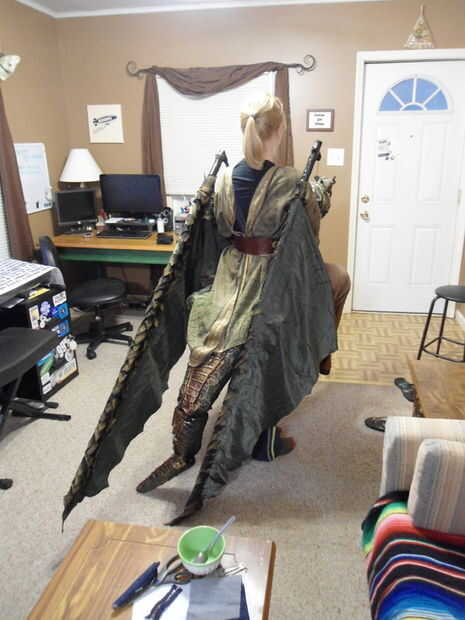 Las alas no son pesados, pero no exactamente son luz tampoco. Para hacer que se expanda, necesitan ser hacia atrás o hacia arriba. Tirando hacia atrás es imposible (porque estás en el traje), y tirando hacia arriba es un movimiento extraño. Esto no puede ser reparado en mi traje y no es gran cosa. Sin embargo, si vas a compilar esto, puede que desee pensar en poner las poleas en algún lugar en el dragón para hacerlo más fácil.