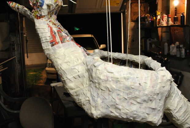 Propongo ver algunos videos de Dan Reeder para aprender un poco de técnica. Estoy agradecido de que su sitio es muy detallada. Si no hubiera tropezado en la misma, probablemente habría intentado utilizar latex o espuma para construir el dragón. Maché de tela es ligera, fuerte y muy barato de hacer. (Sr. Reeder también tiene un libro. No lo tengo, pero parece que podría ser útil.)