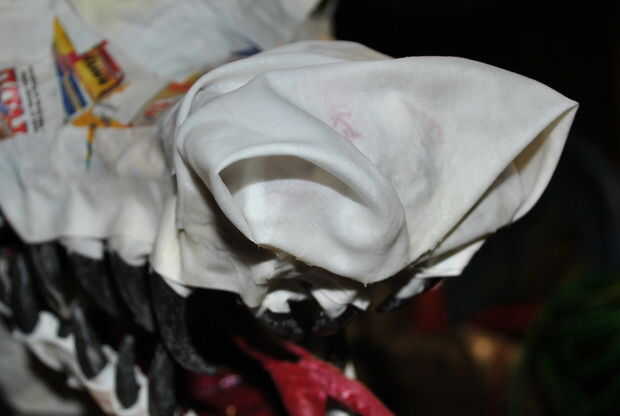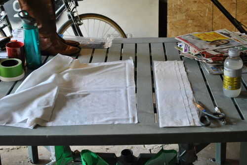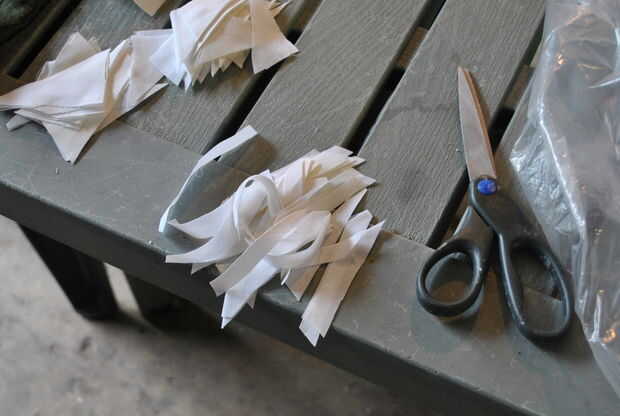Comencé cortando alrededor de la mitad de la sábana en tiras de ancho, luego cortar las tiras de ancho en tiras más pequeñas. Completé todas las partes del dragón necesita bandas para y luego cortar las piezas extras en triángulos. No serás capaz de mache de tela el dragón todo de una sola vez, así que no te preocupes de corte de la tela de una sola vez.