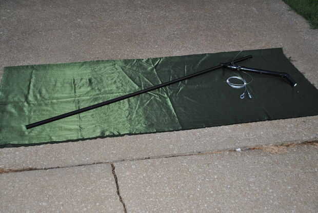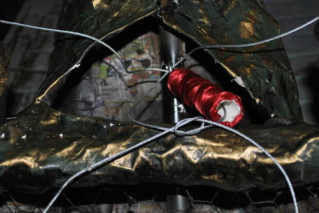 Poner un tornillo de ojal en el tubo del cuello y luego cuerdas el alambre a través de él. Apriete el nudo, el nudo de cinta aislante de la cubierta y entonces centrado en el tubo de PVC (cubierta de cinta) para ocultar el nudo. El mango se oculta en el cuello.