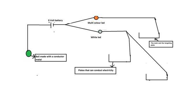Ahora esta máquina está listo. Cuando la bola golpea la placa principal se encenderá la luz de múltiples colores y si la bola golpea uno de la placa falsa entonces blanco led se encenderá. Ver el circuito para tener claro acerca de la máquina
