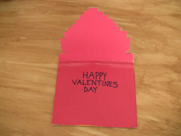 Poner el pedazo de cinta adhesiva para unir las partes superiores del corazón a la aleta pequeña de la tarjeta. Ahora la tarjeta debe ser de una pieza, capaz de abrir y cerrar. Por último, agregar un mensaje en la tarjeta.