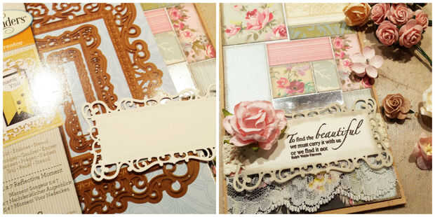 Utilicé un molde para crear una etiqueta para el frente de la tarjeta. Me estampó un sentimiento en la etiqueta y utilizar adhesivo húmedo a adherirse a la tarjeta. Recoger sus flores de papel y hojas de papel y crear un hermoso collage en el lado izquierdo de la tarjeta.