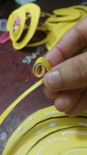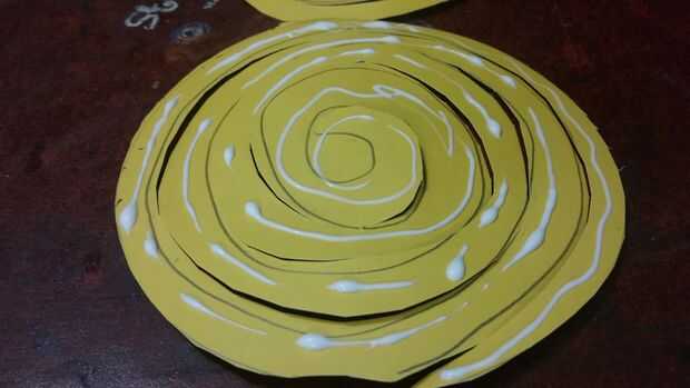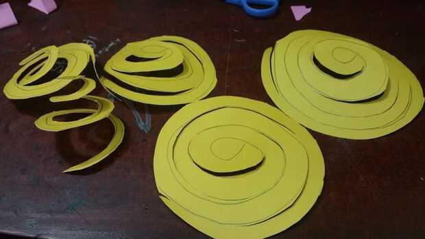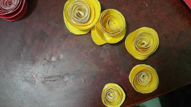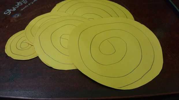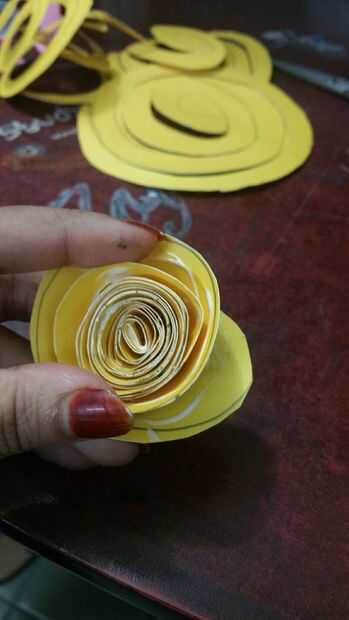 cortar algunos círculos y hacer alguna ronda forma líneas y corte según las líneas. Luego comenzar a rodar de su extremo y hacer una flor