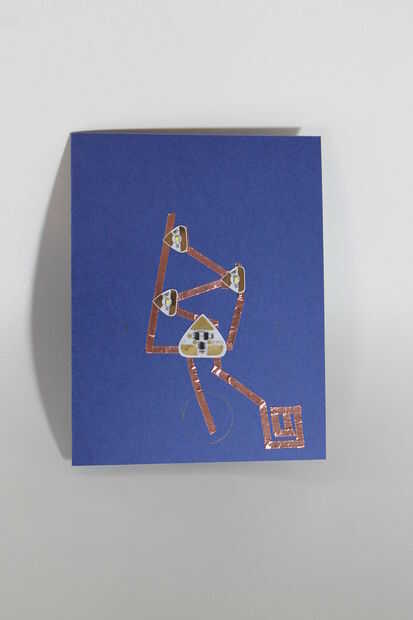 Utilizando el esquema como guía, aplique la cinta de cobre y pegatinas de Chibitronics al frente de la tarjeta. Para mejores resultados, doblar la cinta de cobre para evitar desgarros en las esquinas.