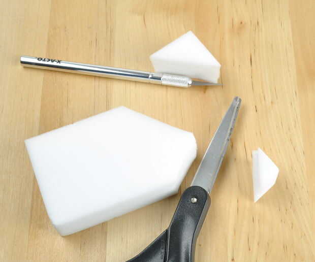 Prepárate tu esponja! Usando tijeras o un cuchillo del exacto, cortar una esquina de la esponja. No tiene que ser que grande, mina sea aproximadamente una pulgada de superficie plana a la punta. Me gusta el corte más limpio del cuchillo del exacto, pero unas tijeras funciona también. Si utilizas un cuchillo del exacto, asegúrese de usar una almohadilla de corte.