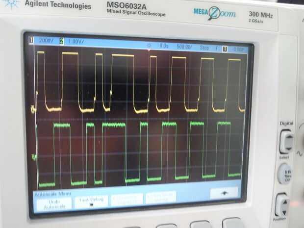 El alcance de la onda de POF S/PDIF muestran la forma de señal en el pin de PCM2906 SPDIF duda (el rastro verde) y la señal en el otput del comparador óptico receptor de (estruendo de PCM2906 - segunda junta).