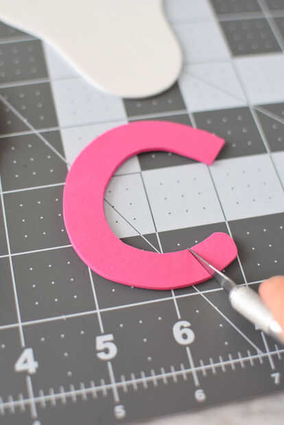 Suavemente con el cuchillo del exacto, puntuación en la parte posterior de la manija rosa. A continuación, pegar el mango rosa a la pieza de blanco con la manija. Deje el extremo de la rosa mango arrastrado a partir de la línea anotada.