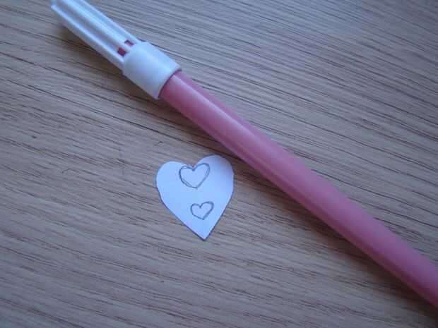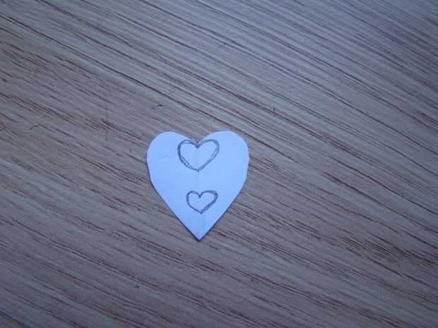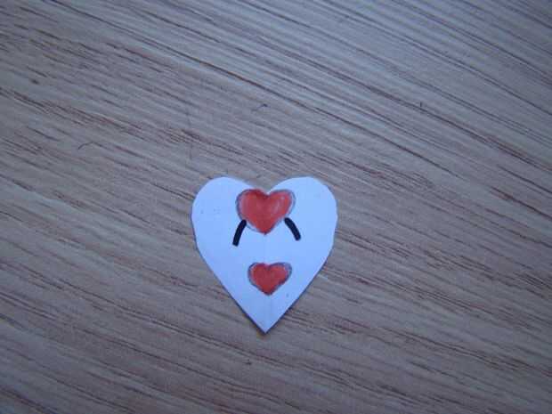 En el corazón blanco, dibujando dos corazones con marcador rosa, uno para la boca y otro para los ojos y hacer dos detalles con marcador negro para marcar las mejillas