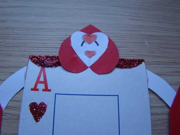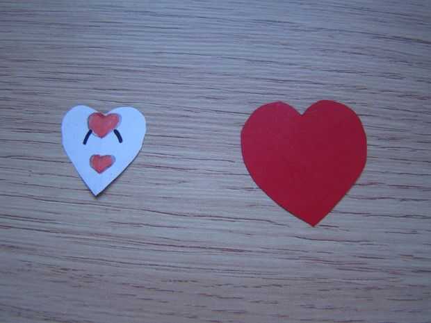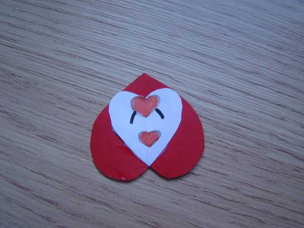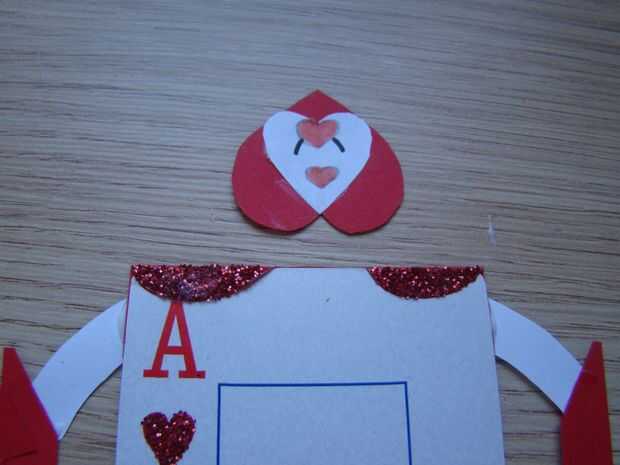Pegar la cara sobre la cabeza, recordando que el corazón rojo debe está al revés. Luego pegar la cabeza entre sus hombros