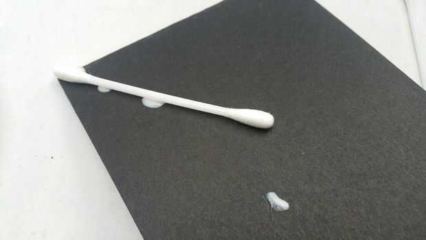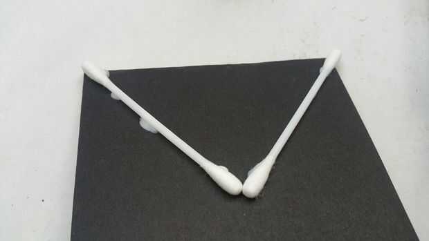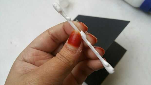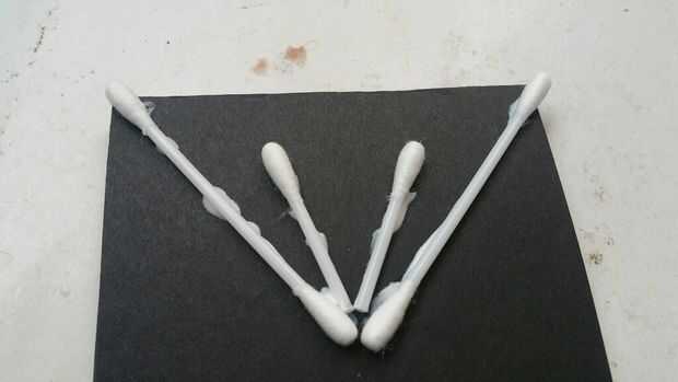 Tome un bastoncillo de algodón y poner pegamento en él y fíjelo con el papel de la tarjeta. Luego coloque más bastoncillos de algodón haciendo una forma de V