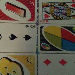 Organizar las 6 tarjetas (yo usé UNO y jugando a las cartas regular para esto) en un rectángulo de 3 x 2 y deje al menos 1/4 de pulgada entre la fila superior e inferior. Únalos con cinta adhesiva cada fila de cartas.