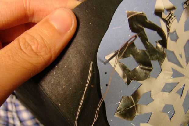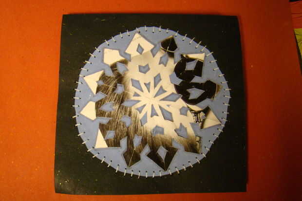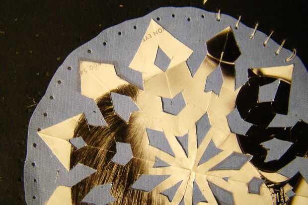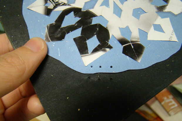 15) poke agujeros paralelos alrededor del círculo de copo de nieve. (Es más fácil empujar los agujeros primero y luego coser, especialmente si el papel es grueso).