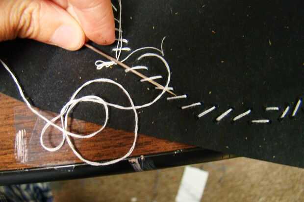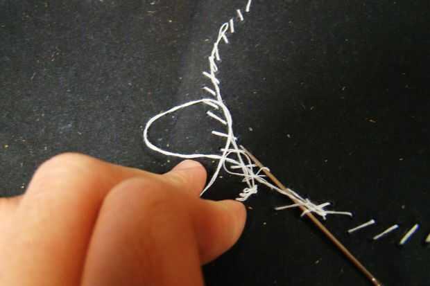 16) coser a través de los agujeros para que se vea como normales puntos (una especie diagonal de puntada de costura). Empezar a coser desde el interior para esconder el nudo.