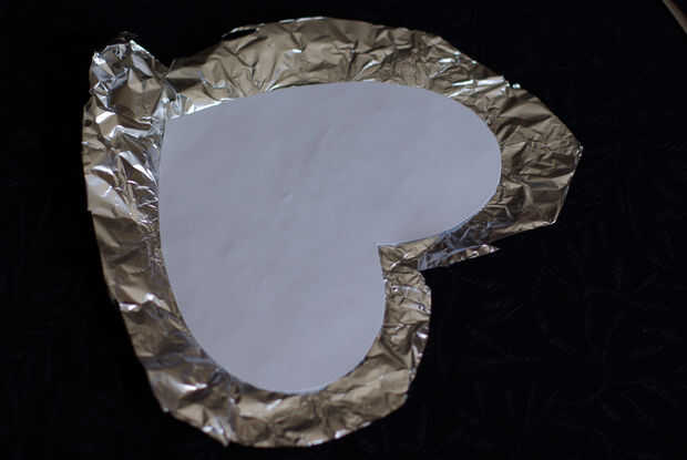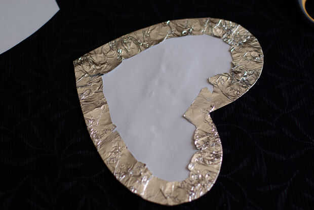 Comenzar a doblar el papel en la cartulina, tirar firmemente contra el borde y aplanando a medida que avanza. Cuando estás cerca de la parte superior del corazón, donde los dos resaltos conocer, cortar un pequeño trozo de papel de sus desechos y colóquelo debajo de donde van las dos tiras. Continúe plegar y aplanar.