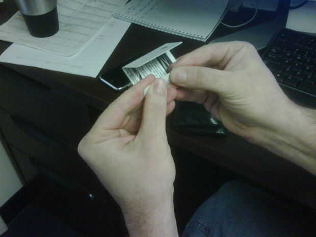 me cansé de llevar alrededor de un soporte o apuntalamiento para arriba mi iPhone para ver muestra así que sacó de una vieja tarjeta de identificación que tenía en mi billetera y doblado para hacer un soporte. Cualquier ID de plástico duro o la tarjeta de crédito vieja funciona y puede ser aplanados de nuevo y se deslizó hacia su billetera cuando termines.