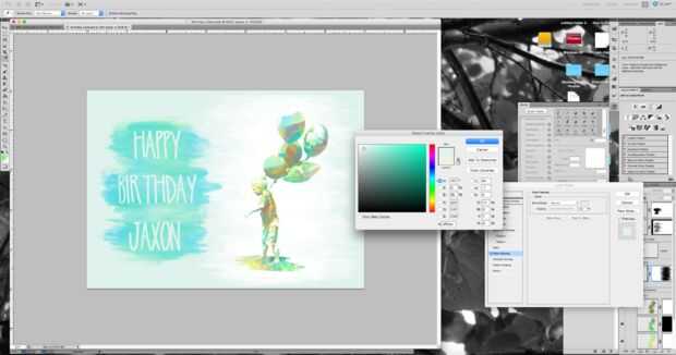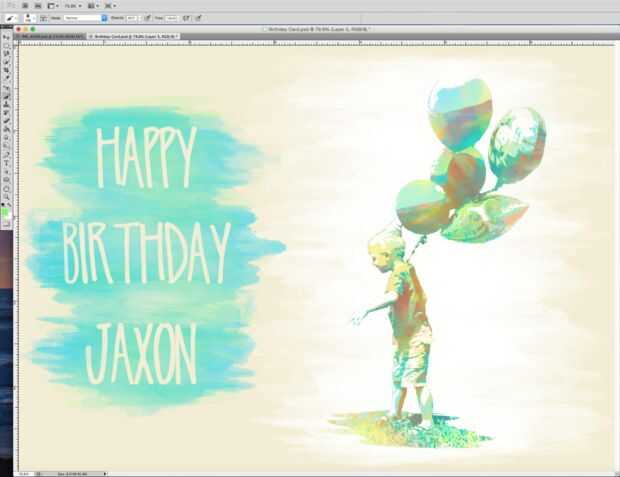 El último paso es hacer los últimos retoques. Para mí eso significaba colocar de nuevo el texto (mediante la herramienta Mover (V)), añadiendo un poco de verde a la acuarela de texto, cambiar el tamaño (comando + T) la imagen, y por último, cambiar el bronceado color (solo un poco en mi caso).