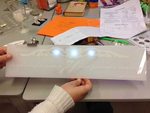 Ella pensó sobre el texto que en la placa, donde las luces se van a colocar y donde y cómo la abuela usaría la batería. El texto y algunas imágenes fueron colocadas en un archivo en CorelDraw y enviadas a la lasercutter. ¿El mensaje a la abuela? : "La abuela más cariñosa ha convertido 71 años hoy" (original en holandés).