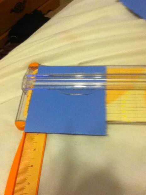 Decidir cómo grande (o pequeño) quiere su tarjeta para grandes. Luego tomar dos pedazos de cartulina y cortar a la medida. Uno es para el interior y uno es para el exterior. Desde que decidí hacer el pájaro el interior que aparece usted, hice la pieza interior verde de la hierba y el azul del exterior de la pieza ya que es donde van a quedar los cerdos. Mi tarjeta es 5" de alto por 4" ancho (doblada) para cortar la cartulina, primero corté la parte 5". Luego dobla la cartulina por la mitad y mide 4" y corte en el lado sin doblar.