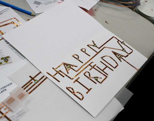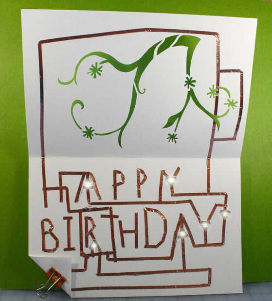 Esta tarjeta de cumpleaños de Chibitronics limpia fue creada por miembros Zeve en la noche de construir Instructables Chibitronics en el CRASHspace durante el evento mensual de circuitos sociales. Chibitronics es un sistema de juego para la construcción de circuitos electrónicos en papel. Elementos del circuito son esencialmente pegatinas con adhesivo conductivo e incluyen LEDs, botones, sensores, efectos e incluso un microcontrolador.