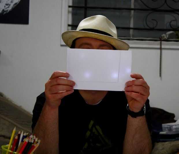 Los LEDs de forma triangular se colocaron en objetivos de oportunidad. Para evitar cortocircuitos en los LEDs, alguna estrategia fue necesaria en "composición" de cartas que había espacio para una almohadilla conductora del LED en una región de una carta y el otro botón en otra región fácilmente conectable al otro nivel de voltaje. Con los LEDs colocados, rastros adicionales fueron colocados para conectarlos, por encima, debajo y a través de otras letras a la batería. Como Zeve podido pintar a él mismo en una esquina, unas huellas que se ejecute sobre y alrededor de la parte posterior, resultando en una tarjeta de cumpleaños de dos capas. En una revisión futura, debería ser posible a través del agujero vias utilizando una perforadora y clavitos metálicos o botones, grandemente reducir la congestión del enrutamiento.