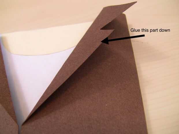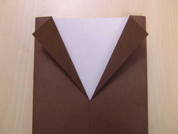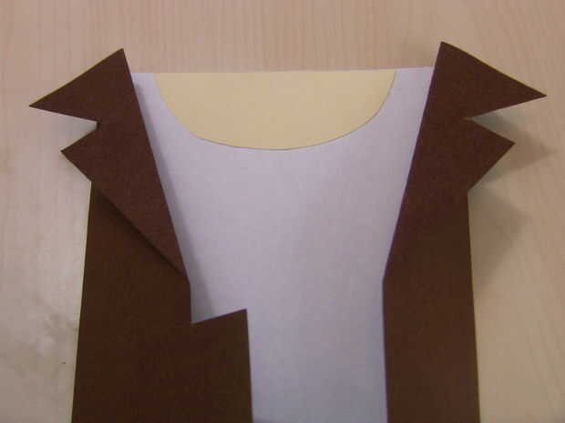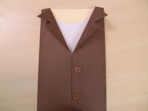 A continuación, tendrá que doblar un poco la parte superior de la parte posterior de la tarjeta para que tengas 2 triángulos marrones (las solapas de la chaqueta) y un triángulo blanco (camisa). Las fotos de este paso muestran cómo hacerlo. Después de eso vas a tener que cortar 2 triángulos pequeños de ambos de las marrones más grandes. Esto hará que se vea más como una chaqueta. Ahora tome el pedazo de papel tan y corte un semicírculo de ella. Pegue el semicírculo en la parte superior del centro del blanco interior. Para dar la capa un aspecto realista, utilice un palillo de pegamento o un rodillo adhesivo para colocar 2 botones marrones al frente de la tarjeta. Las fotos demuestran una vez más, este paso.