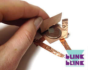 Coloque la batería de botón en soporte de papel y asegúrese de que el lado negativo se enfrenta hacia abajo y toque la cinta de cobre que viene desde el lado negativo del LED y Asegúrese de que el lado positivo de la batería quede hacia arriba. Recuerde negativo con negativo y positivo con positivo.