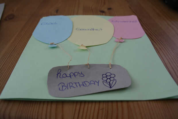 Ahora pegue los globos a la tarjeta. No pegar la señal a la tarjeta! Debe colgar allí.
