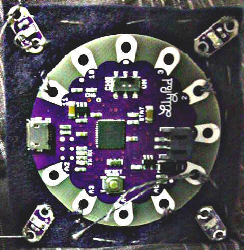 Iniciar una línea de hilo conductor en el agujero de alfiler de lilypad de – (Asegúrese de recorrer por lo menos 3 veces como de costumbre) y coser el borde izquierdo del fieltro evitando cualquier contacto con el hilo que conecta el extremo positivo del LED a lilypad 11 del agujero de alfiler. Una vez que llegue al borde izquierdo de la fieltro coser a la esquina superior izquierda y coser 3 a 4 veces a través del agujero de alfiler de LED de – . Con la misma pieza de hilo conductor coser el borde superior del fieltro a la parte superior derecha del fieltro y coser el hilo conductor al menos 3 veces en la parte superior derecha – LED del agujero de alfiler. Es el final de esa línea.