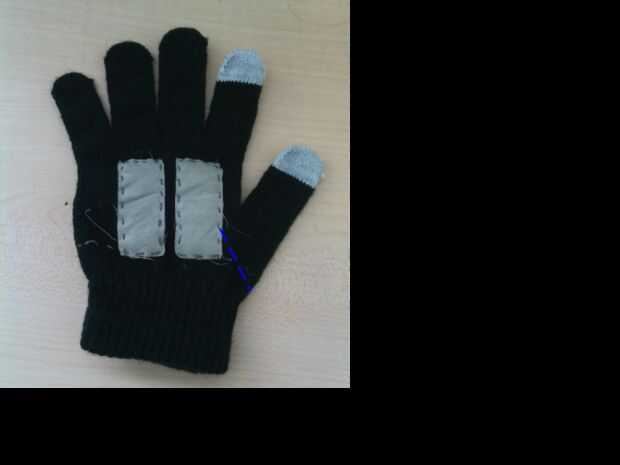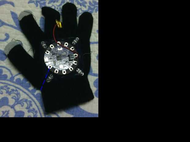 Ahora que el parche de luz intermitente se une al guante que esté listo para conectar los parches mediante las sueltas 4-6 pulgadas que le tuve que dejar en el paso 3. Primero voltear el guante para que los parches son hacia arriba. Comience con la hebra del hilo conductor que viene en el parche derecho y coser en la tela del guante y alrededor hacia el otro lado. Hacer su camino de hilo ir debajo del pulgar, por el otro lado y conectar a lilypad estenopeica A2.