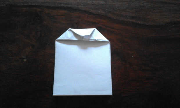 El extremo más largo debe estar detrás el extremo corto. Doblar los extremos abiertos a lo largo de las líneas de rayado. Ahora dobla la esquina hacia el centro de la bolsita de té.