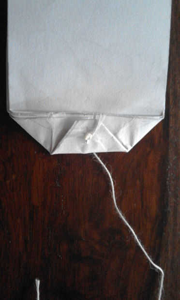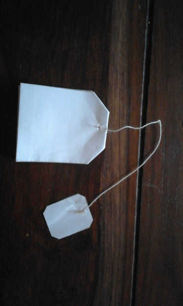 Tomar el hilo y anudar a la bolsita de té de papel. En el otro lado nudo a la etiqueta de la bolsita de té.