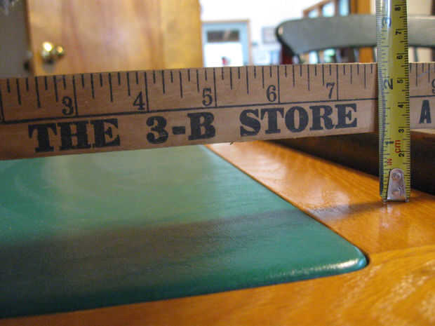 Espero que usted puede ver la diferencia de nuestra mesa de comedor y mesa, 1,125". Hay una cinta métrica en el borde derecho de la foto que podría ser recortada apagado. El criterio de tienda 3-B es un desvergonzado enchufe para mi abuelo General Store, que se cerró en 1955. Me
