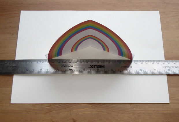Alinear el arco iris en la tarjeta de felicitación abierta por lo que es justo en el centro y pegar las pestañas de abajo. Usted quiere asegurarse de que el arco iris es ahora bastante abajo de la tarjeta que no sobresalen de la parte superior cuando la tarjeta se dobla cerrado - en otras palabras, más abajo del eje vertical de la tarjeta que el arco iris es alto. El ángulo de la base de formas no es crucial, pero tiene que ser uno o el arco iris cae plano.