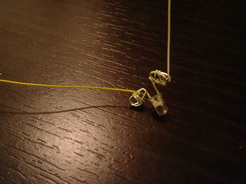 Cuando terminado de banda de las patas de los LEDs, los cables de banda en las piernas. Los cables blancos se sujetará a la pata positiva del LED y los cables amarillos se sujetará a la pata negativa del LED. Hay dos extremos de los alambres que son rayas largo y uno corto. Banda el cable pelado uno alrededor de las patas del LED.