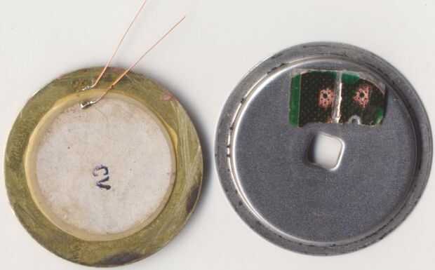 Aquí, he utilizado el centro de un disco de disquete de 3 1/2" para la cámara. Tiene un corte rectangular redondeado que le enchufamos con un trozo de platina, perforado para aceptar los dos cables que conectan el elemento piezoeléctrico.